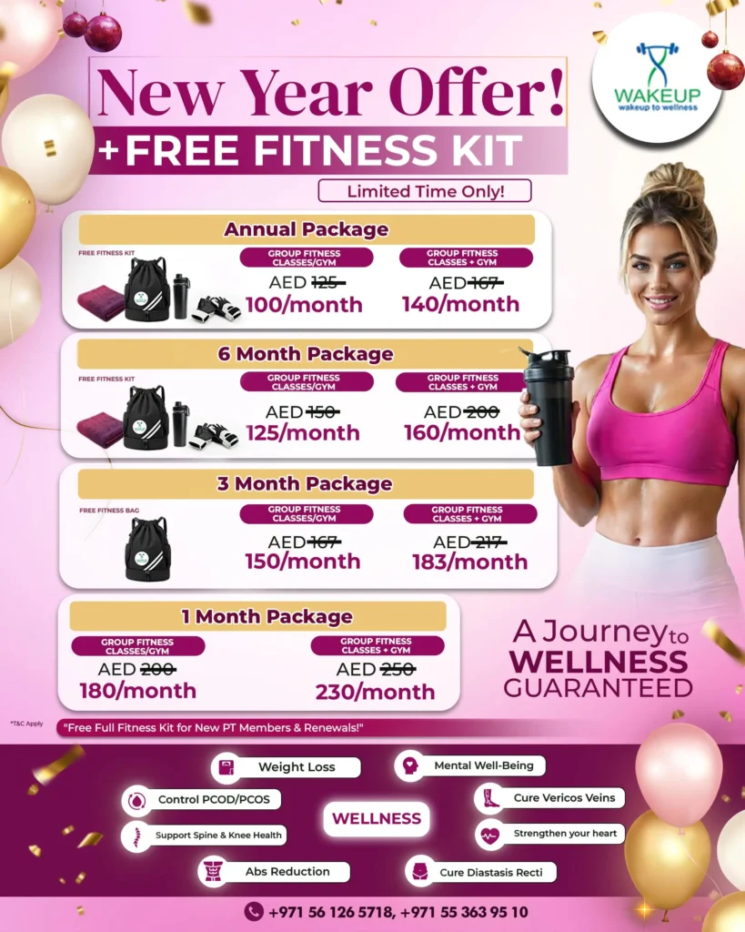 Wakeup Ladies Fitness Center is Mussafah’s womens only gym with its own branded fitness app “Wakeup to Wellness”. From 1000+ guided workouts to expert-designed diet plans, our platform lets you track calories, water intake, and fitness goals effortlessly. Create your own routines, explore 1000+ healthy recipes, and receive ongoing support from certified trainers — all in one space.